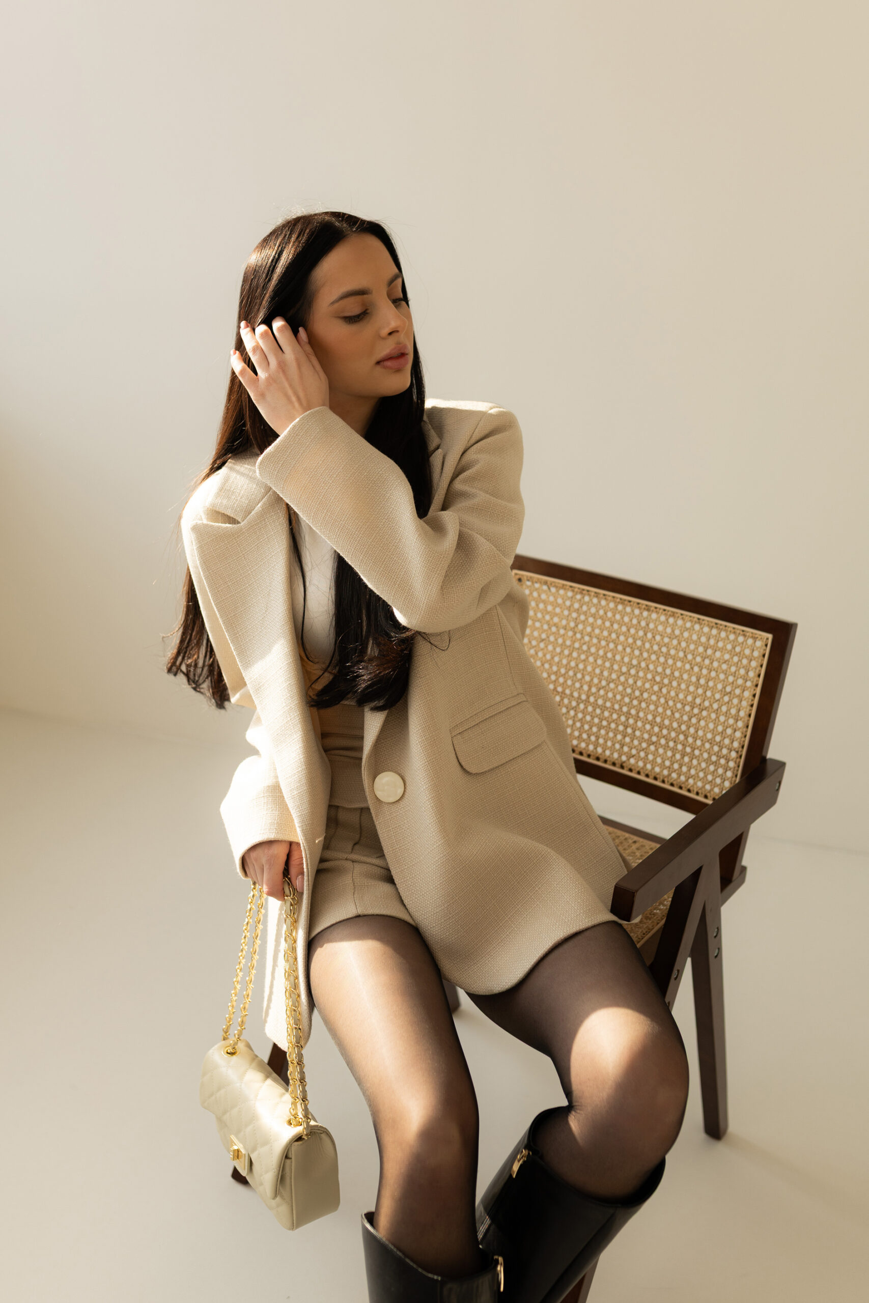 Subtelny komplet w ciepłym, beżowym odcieniu tworzy elegancką i spójną stylizację o ponadczasowym charakterze. Marynarka o klasycznym kroju delikatnie podkreśla sylwetkę, a krótkie spodenki dodają lekkości i nowoczesności. Idealny wybór zarówno na spotkania, jak i stylowe wyjścia, gdzie liczy się wyczucie stylu i komfort noszenia. Tkanina przyjemnie układa się na ciele, zapewniając swobodę ruchów przez cały dzień.