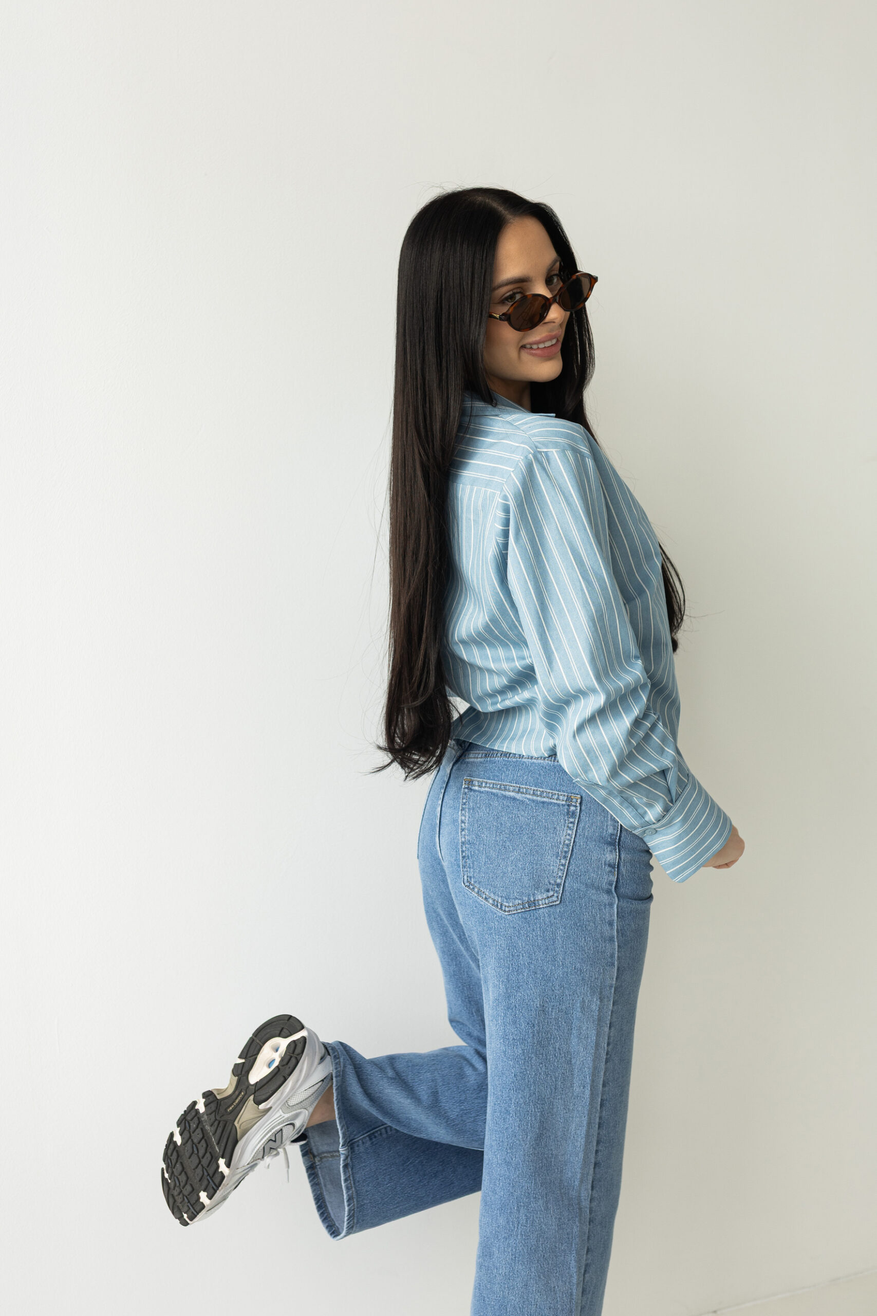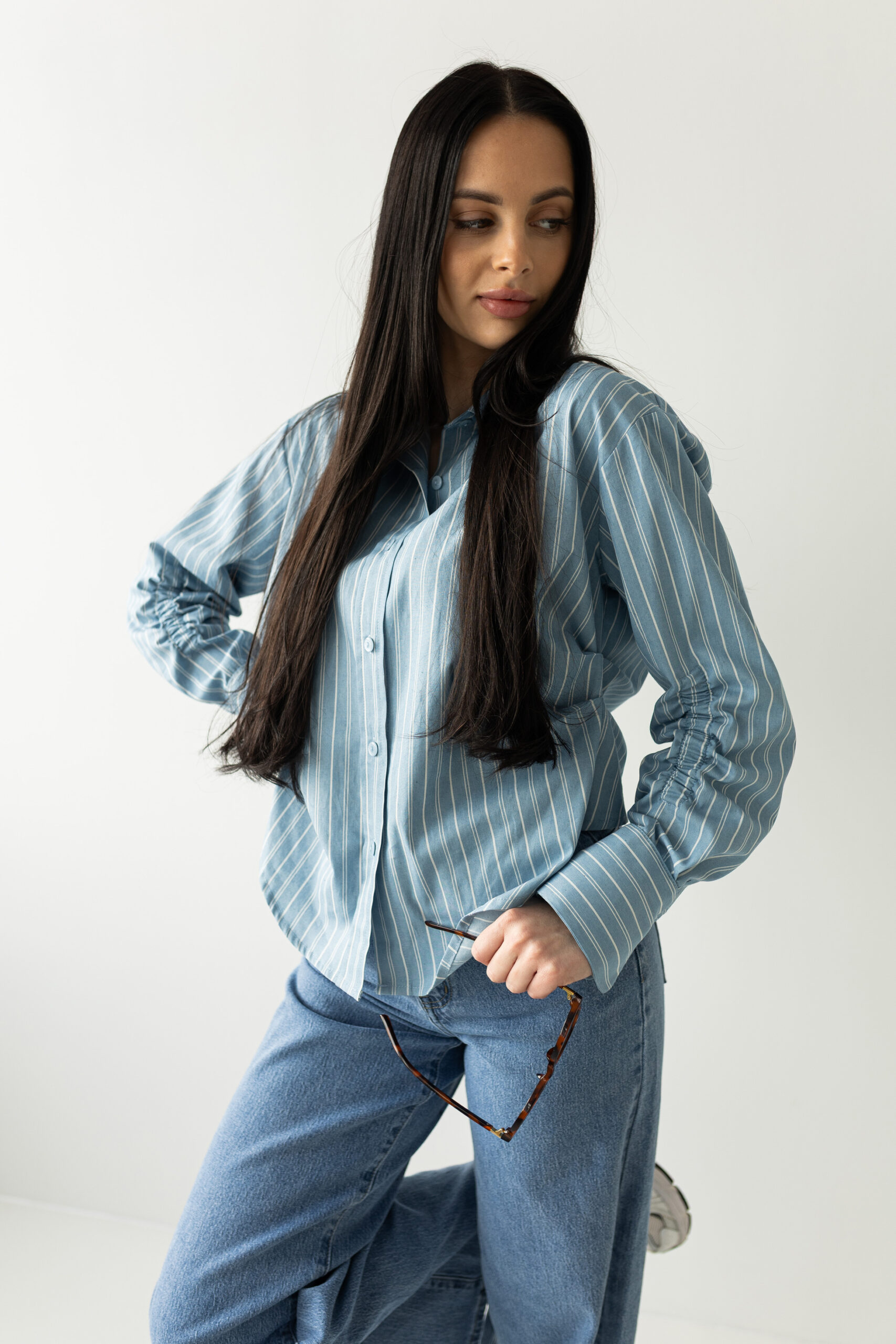 Lekka koszula w odcieniu baby blue wprowadza świeżość i subtelną elegancję do codziennych stylizacji. Klasyczny fason z kołnierzykiem i delikatnym dopasowaniem pięknie układa się na sylwetce, a subtelne drapowania przy rękawach i bokach podkreślają jej linię. Świetnie sprawdzi się zarówno w zestawieniu z jeansami, jak i w bardziej eleganckich stylizacjach. Materiał zapewnia komfort noszenia i swobodę ruchów przez cały dzień.